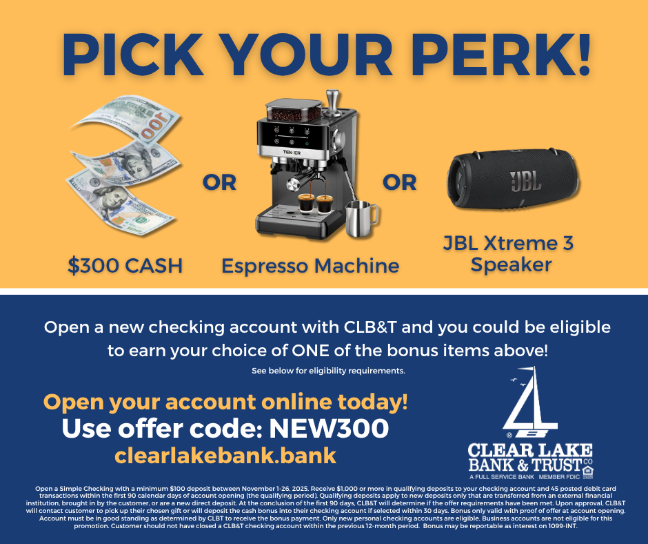 Open a Simple Checking with a minimum $100 deposit between November 1-26, 2025. Receive $1,000 or more in qualifying deposits to your checking account and 45 posted debit card transactions within the first 90 calendar days of account opening (the qualifying period). Qualifying deposits apply to new deposits only that are transferred from an external financial institution, brought in by the customer, or are a new direct deposit. At the conclusion of the first 90 days, CLB&T will determine if the offer requirements have been met. Upon approval, CLB&T will contact customer to pick up their chosen gift or will deposit the cash bonus into their checking account if selected within 30 days. Bonus only valid with proof of offer at account opening. Account must be in good standing as determined by CLBT to receive the bonus payment. Only new personal checking accounts are eligible. Business accounts are not eligible for this promotion. Customer should not have closed a CLB&T checking account within the previous 12-month period. Bonus may be reportable as interest on 1099-INT.